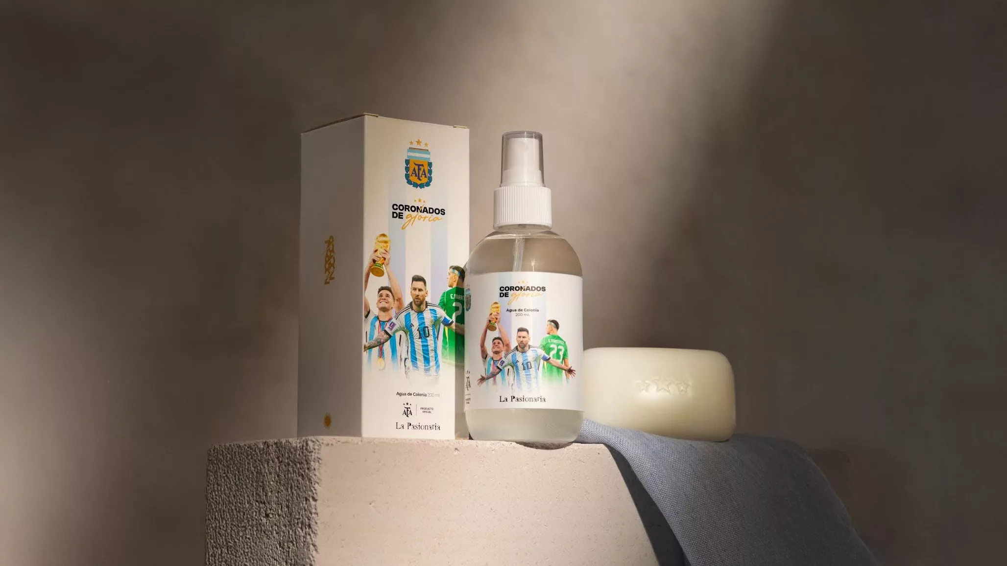 “Coronados de Gloria”, es la línea celeste y blanca más juvenil que incluye un Agua de Colonia y un Jabón Vegetal y se caracteriza por sus notas verdes, cítricas y frutales que, “Como la salida del equipo en la cancha, despierta los sentidos con potencia y claridad”, cuenta Carina Cavazza, Socia Fundadora y Directora de Diseño de La Pasionaria. Todos los productos estarán disponibles en los locales de la marca y en farmacias, tiendas y perfumerías de todo el país.