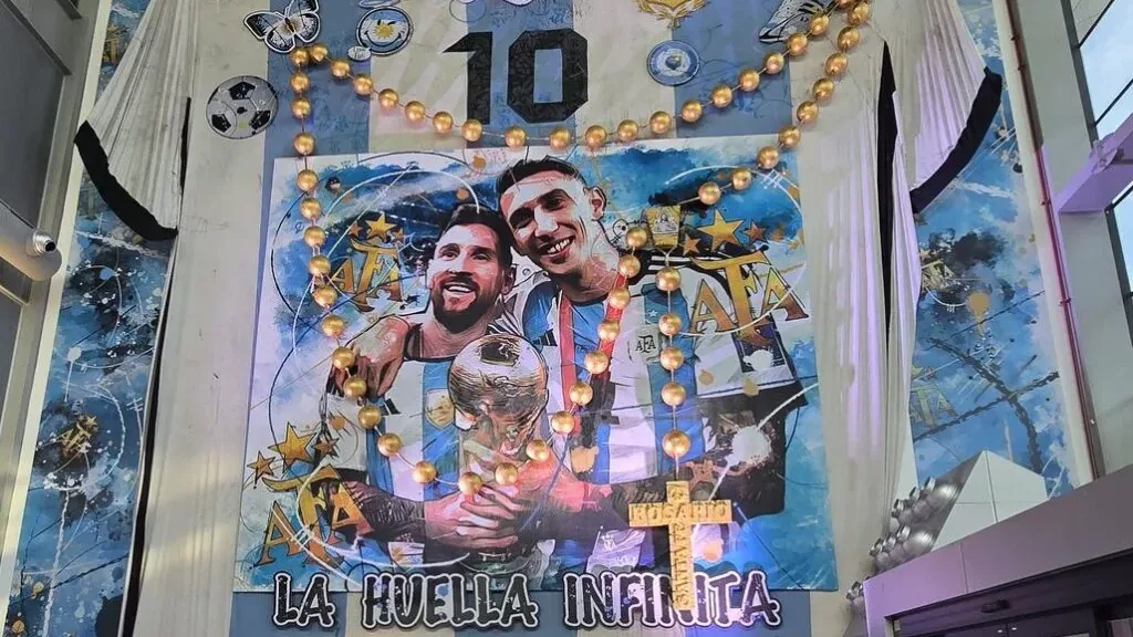 El mural agiganta las figuras de Messi y Di María, dos rosarinos campeones del mundo, que representan al país globalmente, y simbolizan la identidad, el esfuerzo y los sueños que nacen en la provincia de Santa Fe, acompañando el movimiento y las historias de quienes parten y regresan a Rosario, tal como explicaron desde la organización. En paralelo, La Huella Lounge, ubicado en el primer piso del aeropuerto, será un espacio vivo que combinará una galería de arte, una sala de proyección cultural y un punto de encuentro.