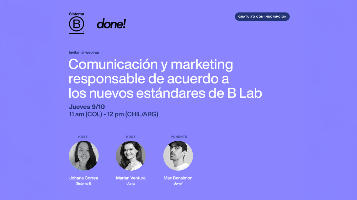 La agencia estratégica y Empresa B certificada done!, con el apoyo de Sistema B, realizará un webinar de lanzamiento de su guía para aplicar prácticas de marketing y relaciones públicas alineadas a los Estándares de B Lab V2.1.